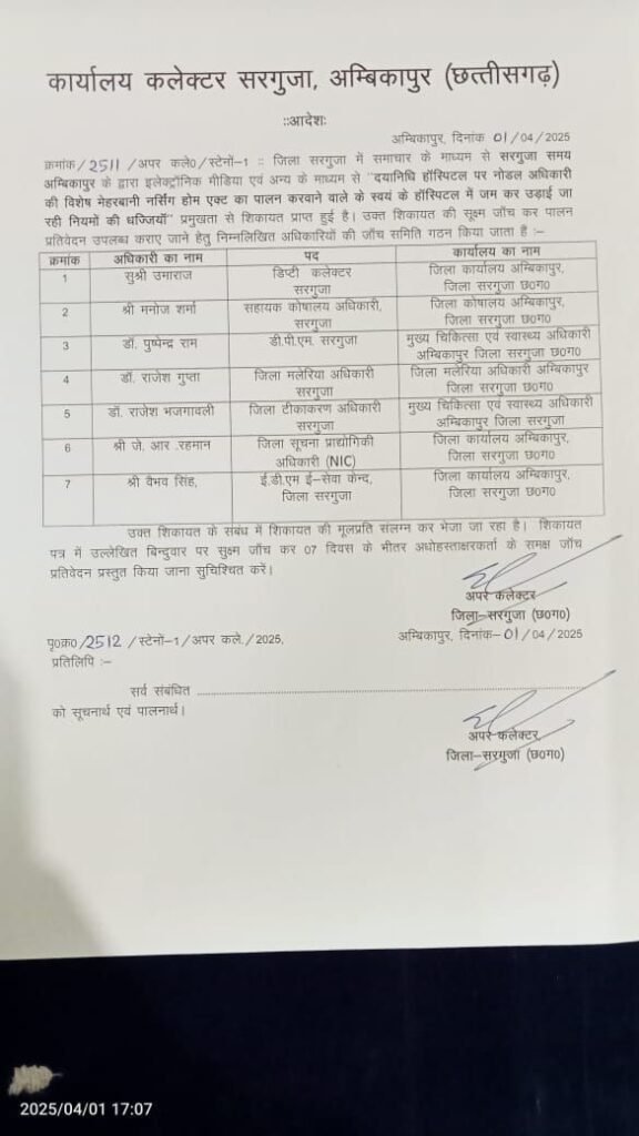 अंबिकापुर/:– जब पैसा और रसूख दोनों आपके पास हो तो फिर किसी से क्या डरना ऐसा ही कुछ मामला इन दिनों स्वास्थ्य मंत्री जी के संभागीय क्षेत्र में चल रहा है सरगुजा के अंबिकापुर में संचालित दया निधि अस्पताल के डॉक्टर और जिले के नर्सिंग होम एक्ट के नोडल अधिकारी डॉ संदीप त्रिपाठी ने प्रभाव और दबाव लगाकर प्रशासन द्वारा गठित की गई जांच टीम में ही बदलाव करा दिया ऐसा आरोप लग रहा है।
