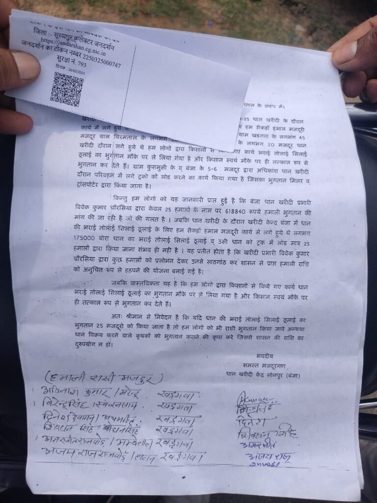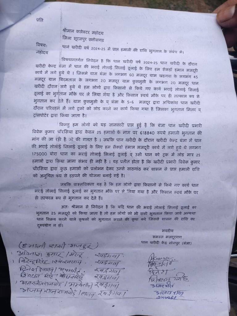 धान खरीदी केंद्र सोनपुर का विवाद थमने का नाम नहीं ले रहा है,,कभी किसान तो कभी हमाल अपने दावें लेकर कलेक्टर पहुंच रहे हैं,,वही एक बात जो दोनों के आवेदनों में सामान्य रूप से सामने आ रही है वह यह कि खरिदि प्रभारी के ऊपर आरोप लगाया जा रहा है,,जहां आज भी हमाल कलेक्ट्रेट पहुंच जनदर्शन में आवेदन दें कार्यवाही की मांग की और शिकायत दर्ज कराई कि खरीदी प्रभारी के द्वारा सांठगांठ कर केवल 25 हमालो के नाम से छः लाख रुपए से अधिक की राशि आहरण की मांग की गई है जबकि सैकड़ों किसानों के द्वारा कार्य किया गया है वही किसानों ने कहा कि 1लाख75000 हजार से अधिक बोरी धान को केवल 25 हमाल कैसे भराई, तौलाई, सिलाई,ठुलाई कर सकते हैं जबकि उसे ट्रकों में भी लोड किया गया है,,जहां हमालो ने आरोप लगाया कि खरीदी प्रभारी के द्वारा 25 हमालो से सांठगांठ कर उन्हें प्रलोभन दे शासन प्राप्त राशि का गबन करने की योजना बनाई जा रही है,,जहां हमालो ने मांग की की शासन से प्राप्त हमाली राशि यदि सभी हमालो को नहीं दि जाती तो किसानों को ही हमाली राशि का भुगतान किया जाना चाहिए,,वही हमालो ने कहा कि कलेक्टर महोदय के द्वारा उचित कार्यवाही का आश्वासन दिया गया है,,जहां एक ओर सोनपुर धान समिति केन्द्र का मामला आएं दिन नया रुख लें रहा है वही अब देखने वाली बात होगी कि प्रशासन किसकी ओर फैसला करता है यह तो आने वाला वक्त ही बताएगा,,,