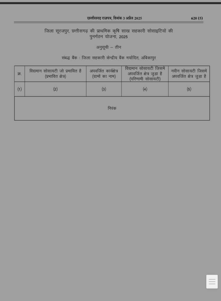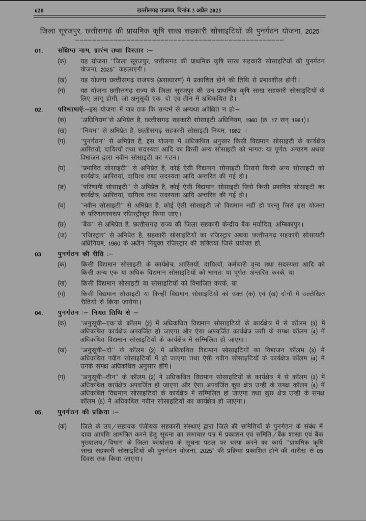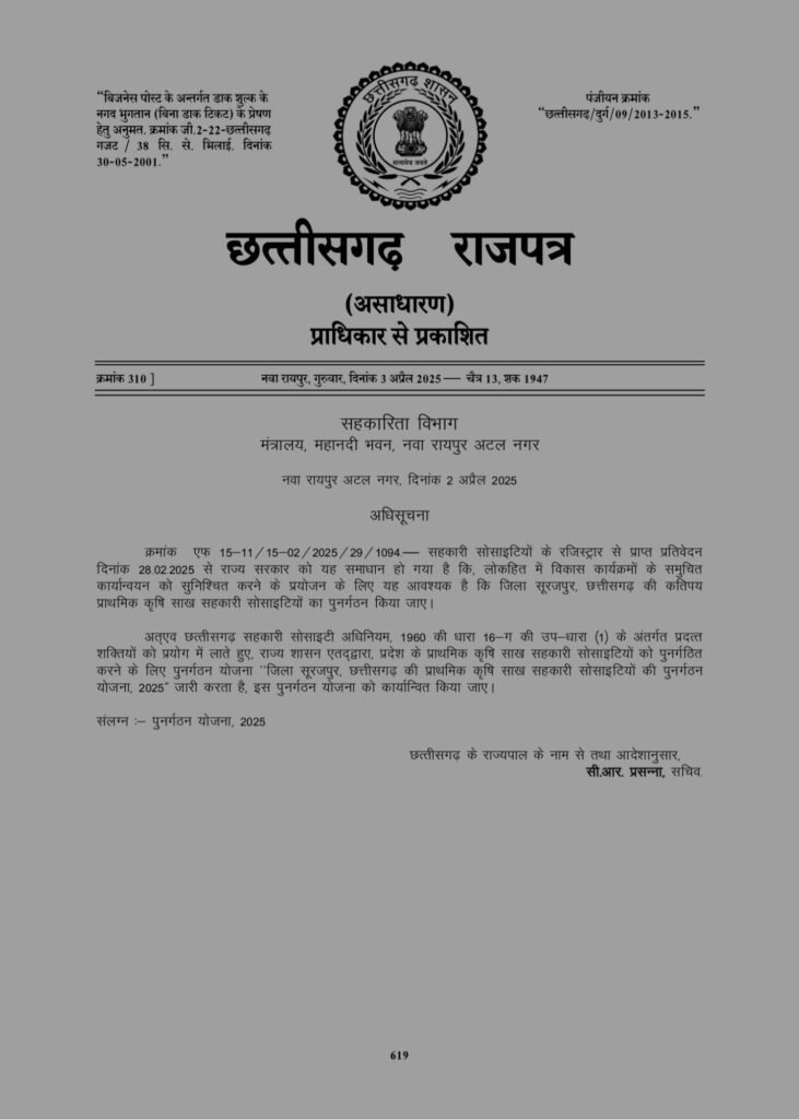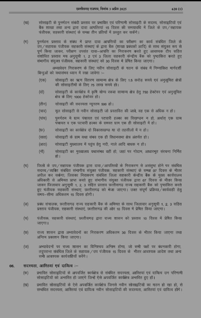श्रीमती राजवाड़े ने कहा, यह निर्णय किसानों की वर्षों पुरानी मांग के समाधान की दिशा में एक अहम कदम है। राज्य सरकार किसानों के हितों की रक्षा और कृषि व्यवस्था को सशक्त बनाने के लिए पूरी तरह प्रतिबद्ध है। यह निर्णय छत्तीसगढ़ शासन द्वारा जारी प्राथमिक कृषि साख सहकारी समितियों के पुनर्गठन योजना के अंतर्गत लिया गया है, जिसका प्रकाशन 3 अप्रैल 2025 को छत्तीसगढ़ राजपत्र में किया गया।