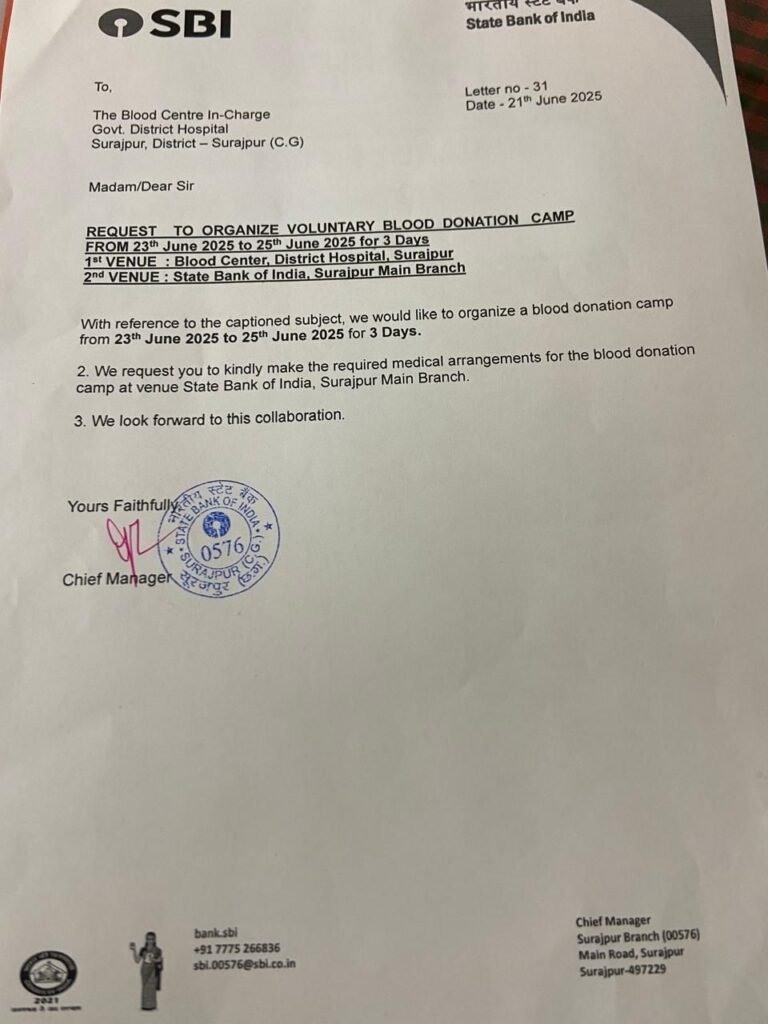 सूरजपुर – भारतीय स्टेट बैंक समय समय पर सामाजिक दायित्व को निभाते रहती है और जरुरत मंदों के मदद को लेकर हर संभव प्रयास करती है,,जहां इस वर्ष भारतीय स्टेट बैंक के 70 वें स्थापना दिवस के अवसर पर भारतीय स्टेट बैंक ने बढ़ रही दुर्घटनाओं को मद्देनजर रखते हुए घायलों की प्राथमिकता व महत्वपूर्ण जरूरत रक्त को लेकर अभियान छेड़ा है,,जहां भारतीय स्टेट बैंक ने स्थापना दिवस के अवसर पर 23,24,25 जुन को मेगा ब्ल्ड डोनेशन कैंप का आयोजन किया है,,जहां भारतीय स्टेट बैंक ने लोगों से इस नेक कार्य में बढ़-चढ़कर हिस्सा लेने की अपिल कि है,,जहां भारतीय स्टेट बैंक के द्वारा ब्ल्ड डोनर यानी रक्त दाता को 500 सौ रुपए देने की भी पहल की है,, जों हर रक्त वीर के खाते में जमा किया जाएंगे,,,,