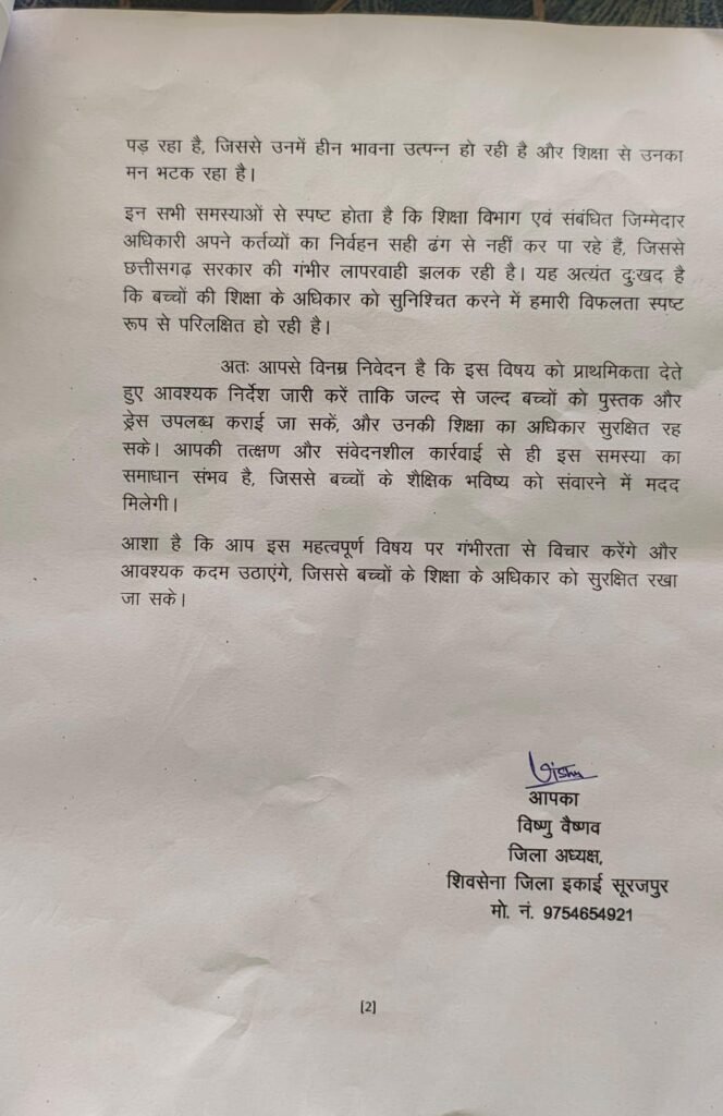 पूरे छत्तीसगढ़ विद्यालयों में पुस्तक और शासकीय विद्यालयों में ड्रेस की अनुपलब्धता हो रही हैं,जो छत्तीसगढ़ राज्य के सभी विद्यालयों में अध्ययनरत बच्चों को वर्तमान शैक्षणिक सत्र में अब तक पाठ्यपुस्तकें एवं शासकीय विद्यालय में पुस्तक,यूनिफॉर्म (ड्रेस) उपलब्ध नहीं हो पाई हैं। इस कारण राज्यभर के लाखों विद्यार्थियों की पढ़ाई-लिखाई चौपट हो रही है विशेष रूप से यह जानकारी सामने आई है कि बारकोड स्कैनर की अनुपलब्धता के कारण पुस्तक वितरण की प्रक्रिया बाधित है। यह समस्या बच्चों की शिक्षा के अधिकार में बाधा बन रही है साथ ही ड्रेस वितरण भी समय पर नहीं हो पाने के कारण बच्चों को बिना यूनिफॉर्म स्कूल जाना पड़ रहा है, जिससे उनमें हीन भावना उत्पन्न हो रही है और शिक्षा से उनका मन भटक रहा है इन सभी समस्याओं से स्पष्ट होता है कि शिक्षा विभाग एवं संबंधित जिम्मेदार अधिकारी अपने कर्तव्यों का निर्वहन सही ढंग से नहीं कर पा रहे हैं, जिससे छत्तीसगढ़ सरकार की गंभीर लापरवाही झलक आ रही है माननीय मुख्यमंत्री जी से निवेदन है कि इस विषय को प्राथमिकता देते हुए आवश्यक निर्देश जारी करें ताकि जल्द से जल्द बच्चों को पुस्तक और ड्रेस उपलब्ध हो सकें और उनकी शिक्षा के प्रति ज्यादा रुचि बढ़ सके!