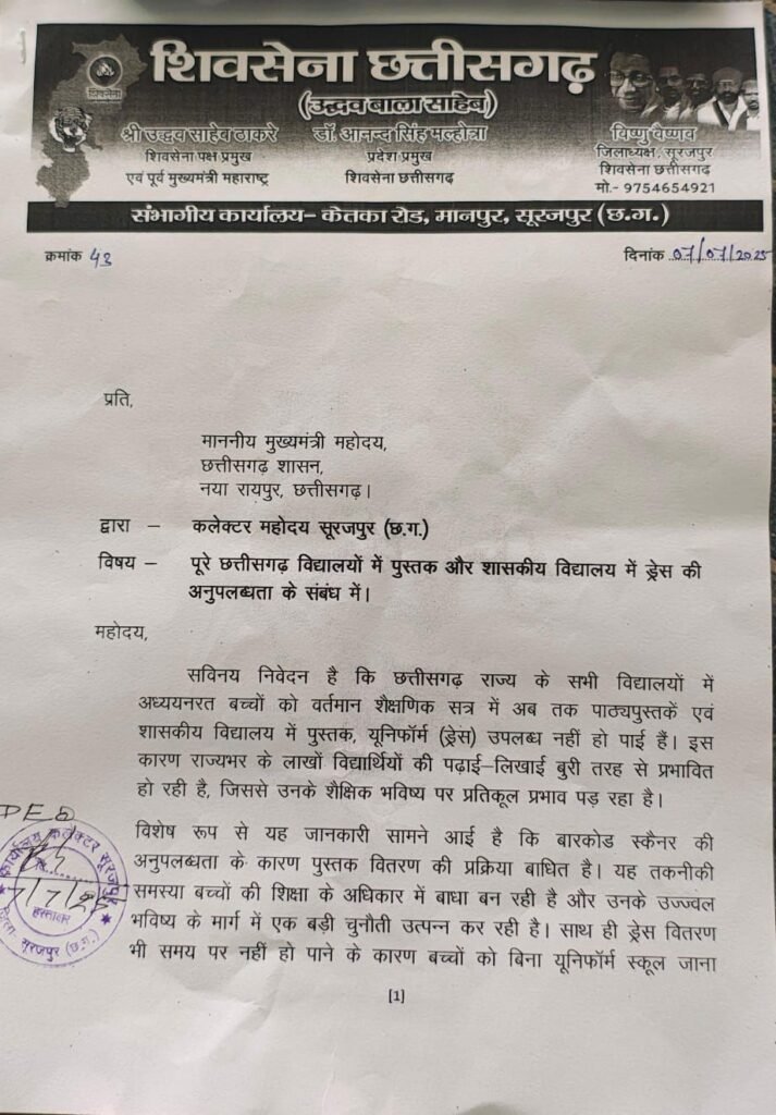 पूरे छत्तीसगढ़ विद्यालयों में पुस्तक व ड्रेस के अनुपलब्धता के संबंध में दिया शिवसेना ने ज्ञापन