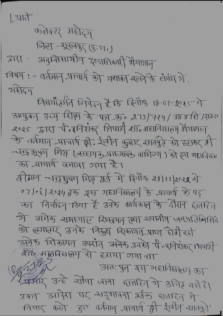 सूरजपूर– सूरजपूर जिले के भैयाथान स्थित पंडित रविशंकर त्रिपाठी शासकीय महाविद्यालय के छात्रों ने कलेक्टर सूरजपुर के नाम एसडीएम को ज्ञापन सौंपा है,,जहां महाविद्यालय के समस्त छात्रों ने मांग की है कि वर्तमान में जो महाविद्यालय के प्राचार्य रंजीत सातपुते है उन्हें हटाने उच्च शिक्षा आयुक्त ने आदेश जारी किया है वही उनके जगह पर महाविद्यालय के सहायक अध्यापक चन्द्रभुषण मिश्र जों पूर्व में इस महाविद्यालय के प्रभारी प्राचार्य रहे हैं उन्हें पुनः नियुक्त किए जाने आदेश जारी किया गया है,,जिसका छात्रों ने विरोध किया है और वर्तमान प्राचार्य रंजीत सातपुते को ही प्राचार्य के बनाए रखने ज्ञापन सौंपा है,,जहां छात्रों ने बताया कि दिनांक 18/07/2025 को आयुक्त उच्च शिक्षा के द्वारा पत्र क्रमांक 279/724 जारी किया गया है जिसमें वर्तमान प्राचार्य रंजीत सातपुते को हटाकर उनके जगह सहायक प्राध्यापक चन्द्रभुषण मिश्र को प्राचार्य बनाए जाने आदेश जारी किया है,,जबकि चन्द्रभुषण मिश्र पूर्व में इस महाविद्यालय (कालेज) के प्राचार्य पद पर लगभग एक से डेढ़ वर्ष तक रहें इस दौरान छात्रहित की अनेक समस्या और शिकायत आई जिसका न तो निराकरण किया गया और नहीं कोई उचित व्यवस्था की गई वही इनके विरुद्ध जनप्रतिनिधियों को भी शिकायत प्राप्त होती रही और जनप्रतिनिधियों ने इनकी कार्यशैली की शिकायत की,,जहां अनेक शिकायतों के बाद इन्हें हटाया गया था और रंजीत सातपुते जी को प्राचार्य बनाया गया था वही रंजीत सातपुते जी के प्राचार्य पद पर रहते हुए अनेक कार्य छात्रहित में हुए और महाविद्यालय को एक नई दिशा मिली तो वहीं जनप्रतिनिधियों ने भी रंजीत सातपुते जी की कार्यशैली की सराहना की,,वही अब उच्च शिक्षा आयुक्त ने अकारण ही आदेश जारी कर रंजीत सातपुते को हटाकर चन्द्रभुषण मिश्र को प्राचार्य बनाए जाने आदेश जारी कर दिया जों सरासर अनैतिक है और छात्रों के भविष्य से खिलवाड़ है,,जबकि चन्द्रभुषण मिश्र के रहते छात्र बहुत ज्यादा परेशान हुए थे और सातपुते जी के प्राचार्य रहने से छात्रों की काफी परेशानियां दूर हुई थी,, अतःछात्रों ने मांग की है कि रंजीत सातपुते को ही महाविद्यालय और छात्र हित व भविष्य को देखते हुए प्राचार्य रहने दिया जाए,,और जारी आदेश को निरस्त किया जाए,, पांच दिवस में इस मांग पर कार्यवाही की जाए,,अन्यथा की स्थिति में समस्त छात्र चरणबद्ध आंदोलन के लिए बाध्य होंगे,, गौरतलब है कि आखिरकार जब छात्र पूर्व प्रभारी प्राचार्य पर आरोप लगा रहे हैं और वर्तमान प्राचार्य को स्थाई रूप से रखने मांग कर रहे हैं तो छात्रों के भविष्य से खिलवाड़ क्यों क्या शिक्षा जैसी चीजों में राजनीति करना उचित है,, आखिर जिसके ऊपर आरोप लगे और उसे हटाया गया उसे फिर प्राचार्य ब