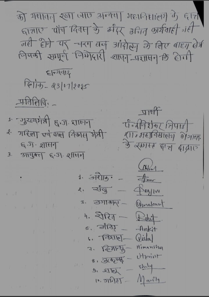 महाविद्यालय के प्रार्चाय को हटायें जाने के आदेश से नाराज छात्रों ने कलेक्टर के नाम एसडीएम को सौंपा ज्ञापन,, सहायक प्राध्यापक को प्राचार्य बनाए जाने से नाराज छात्रों ने दी आंदोलन की चेतावनी,,पांच दिनों के भीतर उचित कार्यवाही कि मांग,,