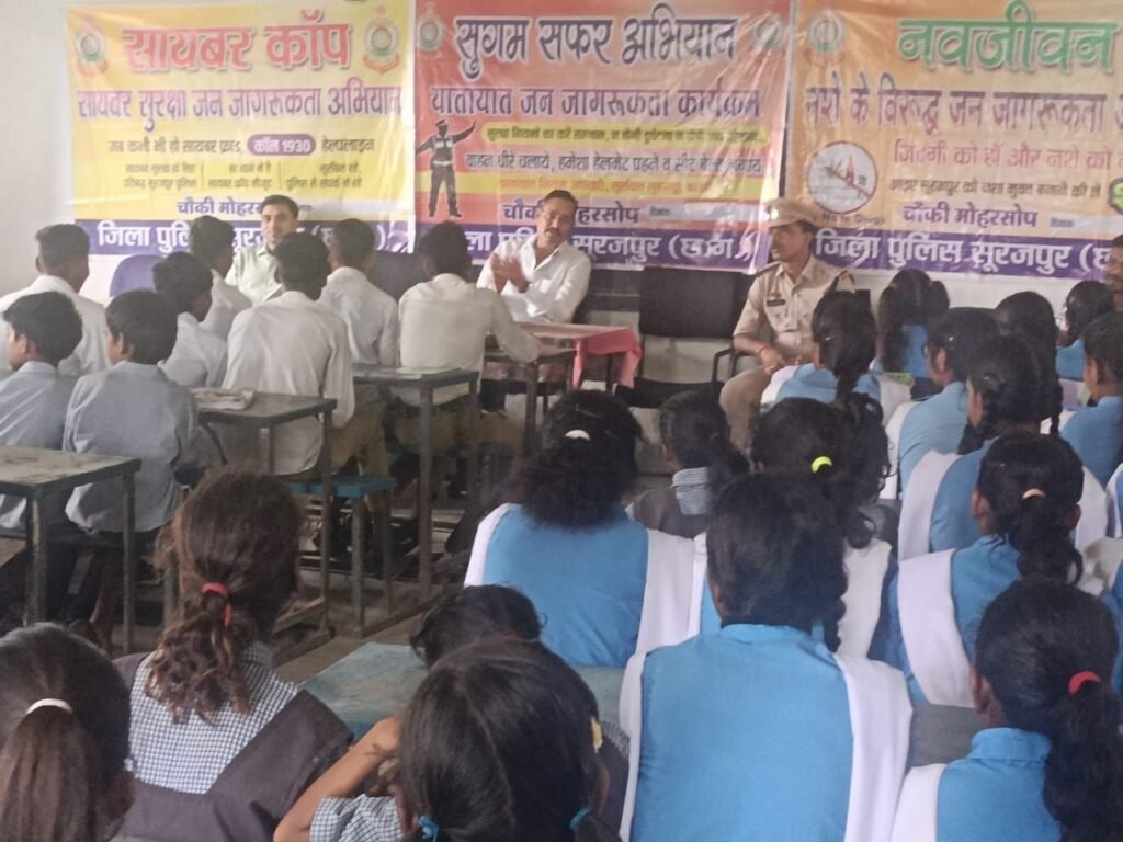 सूरजपुर। जिले के दुरस्थ अंचल मोहरसोप स्थित शासकीय उच्चतर माध्यमिक विद्यालय में सोमवार, 28 जुलाई 2025 को चौकी मोहरसोप एवं चौकी लटोरी पुलिस के द्वारा हायर सेकेण्डरी स्कूल गंगापुर में छात्रों को न सिर्फ साइबर क्राईम, यातायात नियमों को समझाया, बल्कि वर्तमान दौर में साइबर ठग कैसे किसी व्यक्ति को अपने चुंगल में फंसा लेते है उसका डेमो देकर छात्रों को जागरूक किया। डीआईजी व एसएसपी सूरजपुर श्री प्रशांत कुमार ठाकुर के निर्देश पर नियमित रूप से सामुदायिक पुलिसिंग के तहत जन जागरूकता का आयोजन पुलिस के द्वारा किया जा रहा है।