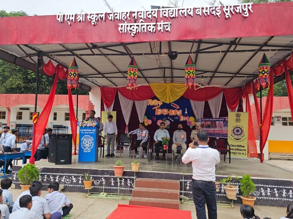 सूरजपुर: बसदेई में शिक्षक दिवस के अवसर पर जिला विधिक सेवा प्राधिकरण द्वारा दो महत्वपूर्ण विधिक जागरूकता शिविरों का आयोजन किया गया। यह कार्यक्रम जवाहर नवोदय विद्यालय बसदेई और ग्राम पंचायत भवन बसदेई में हुआ, जिसका उद्देश्य विद्यार्थियों और आम जनता को कानून के महत्वपूर्ण पहलुओं से अवगत कराना था।