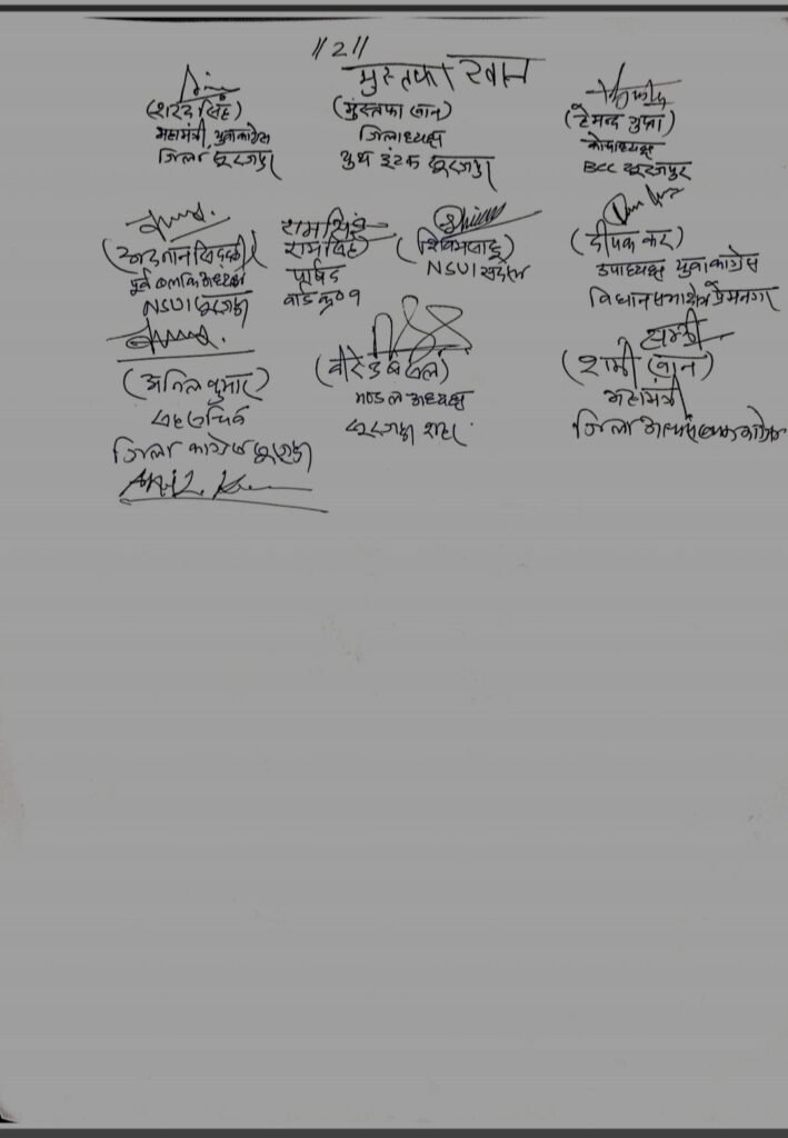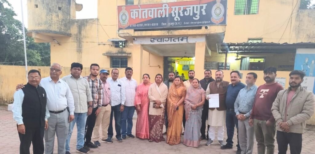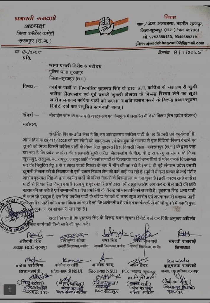कांग्रेस पार्टी से निष्कासित बृहस्पत सिंह द्वारा कांग्रेस की सह प्रभारी सुश्री जरिता लैतफलांग एवं पूर्व प्रभारी कुमारी शैलजा के विरुद्ध रिश्वत लेने का झूठा आरोप लगाकर कांग्रेस पार्टी को बदनाम व क्षवि खराब करने के विरुद्ध जिला कांग्रेस अध्यक्ष भगवती राजवाड़े के नेतृत्व में थाना सूरजपुर में आवेदन देकर एफ आई आर दर्ज कराने की मांग की गई है जैसा कि हाल में ही सोशल मीडिया में वीडियो वायरल हुआ है जिसमें कांग्रेस से निष्कासित बृहस्पत सिंह द्वारा बयान दिया गया है कि कांग्रेस की सह प्रभारी सुश्री जरिता लैतफलांग के द्वारा सरगुजा संभाग के सभी जिले के दावेदारों से जिला अध्यक्ष पद के नियुक्ति हेतु 5 से 7 लाख की मांग की गई है साथ ही पूर्व में भी कांग्रेस की पूर्व प्रभारी कुमारी शैलजा के खिलाफ भी रिश्वत लेने की मांग की है पूर्व में भी ऐसे आरोपों के कारण बृहस्पत सिंह को कांग्रेस से निष्कासित किया गया था इससे कांग्रेस पार्टी की क्षवि खराब हो रही है इस बयान को लेकर कांग्रेसजनों ने थाना सूरजपुर में आवेदन देकर एफ आई आर दर्ज कराने की मांग की है इस दौरान पूर्व जिला पंचायत उपाध्यक्ष नरेश राजवाड़े,ब्लॉक कांग्रेस अध्यक्ष अश्विनी सिंह,जिला कांग्रेस उपाध्यक्ष रामकृष्ण ओझा,नगर पालिका अध्यक्ष कुसुमलता राजवाड़े,जिला कांग्रेस महामंत्री मनोज डालमिया,ऊषा सिंह,जफर हैदर,गैबीनाथ साहू,विष्णु कसेरा,मनोज अग्रवाल,हेमेंद्र गुप्ता,वीरेंद्र बंसल,एनएसयूआई जिलाध्यक्ष आकाश साहू,शरद सिंह,दीपक कर,कौनेन अंसारी,सावित्री शर्मा,मुस्तफा खान,रामसिंह,शिवम साहू,अनिल कुमार,शम्मी खान,अदनान सिद्दीकी एवं अन्य कार्यकर्ता उपस्थित थे..
