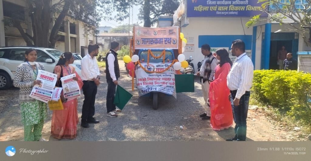 अभियान की पहली वर्षगांठ के मौके पर 1 नवम्बर 2025 से 26 जनवरी 2026 तक 100 दिवसीय विशेष जागरूकता अभियान चलाया जा रहा है। इसी क्रम में आज अंबिकापुर स्थित कलेक्ट्रेट परिसर से समर्पित संस्था के प्रोजेक्ट एक्सेस टू जस्टिस के तहत बाल विवाह मुक्त जागरूकता रथ को महिला एवं बाल विकास विभाग के जिला कार्यक्रम अधिकारी जे.आर. प्रधान ने हरी झंडी दिखाकर रवाना किया।