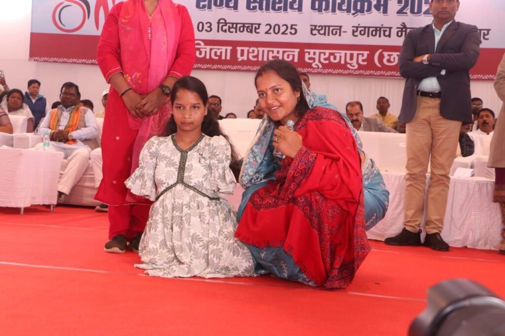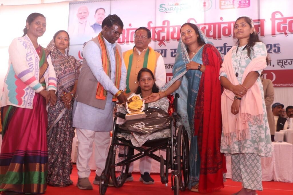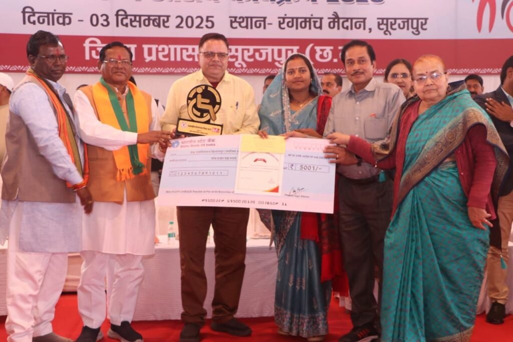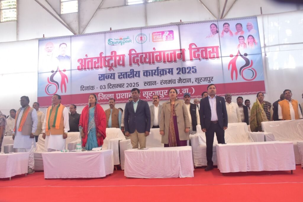 सूरजपुर/ 03 दिसंबर 2025/ अंतर्राष्ट्रीय दिव्यांगजन दिवस के अवसर पर राज्यस्तरीय कार्यक्रम का आयोजन आज नगर पालिका परिषद कार्यालय के समीपस्थ स्थित रंगमंच सूरजपुर में किया गया। कार्यक्रम में दिव्यांगजनों के सशक्तिकरण को बढ़ावा देने और समाज में उनकी महत्वपूर्ण भूमिका को रेखांकित किया गया। कार्यक्रम में दिव्यांगजनों को 10 मोटराइज्ड ट्राईसाइकिल, 20 ट्राईसाइकिल, 15 व्हील चेयर, 15 जोड़ी बैसाखी, 05 ब्लाईंड स्टिक , 20 छड़ी ,04 नग एमआर किट प्रदान किया गया। कार्यक्रम में दिव्यांग जनों के लिए किया जा रहे उत्कृष्ट कार्य हेतु जिला गरियाबंद को सर्वाेत्तम जिले के रूप में सम्मानित किया गया। इसके साथ ही राज्य स्तर समिति द्वारा अलग-अलग क्षेत्र में श्रेष्ठ कार्य करने हेतु पांच दिव्यांगजनों को चयनित कर सम्मानित किया गया और प्रत्येक व्यक्ति /संस्था को 5001 रूपये की राशि का चौक प्रदान किया गया। कार्यक्रम में दिव्यांग कुमारी शीतल विश्वकर्मा व ज्ञानोदय के मुक-बधिर बच्चों द्वारा शानदार नृत्य का प्रस्तुतीकरण किया गया। मंत्री श्रीमती लक्ष्मी राजवाड़े ने कहा है कि दिव्यांगजन अपनी क्षमता, योग्यता, संघर्षशीलता और सकारात्मकता के आधार पर समाज में अपना स्थान बनाते हैं। यह आत्मविश्वास ही उन्हें विशेष पहचान देता है। छत्तीसगढ़ शासन उन्हें हर स्तर पर प्रोत्साहित करने और सहयोग प्रदान करने के लिए प्रतिबद्ध है। उन्होंने कहा कि परमात्मा हमारे शरीर में भले ही कोई एक गुण कम करता है, लेकिन बदले में कई गुण बढ़ाकर भी देता है। दिव्यांगजन समाज के महत्वपूर्ण अंग हैं। उनकी अपने-अपने क्षेत्र में योग्यताएं हैं। शासन की भावना सर्वे भवन्तु सुखिनः रही है। दिव्यांगजन के लिए केंद्र व राज्य शासन दोनों कई कल्याणकारी योजनाएं चलाई जा रही हैं। उन्होंने आगे कहा प्रधानमंत्री श्री नरेंद्र मोदी द्वारा दिव्यांग शब्द प्रदान करने से समाज का दृष्टिकोण सकारात्मक रूप से बदला है। इसी सकरात्मक दृष्टिकोण को आप और सभी को आगे बढ़ाना है और उन्हें सामन अवसर प्रदान करना है । कार्यक्रम में पूर्व गृहमंत्री व वन विकास निगम के अध्यक्ष श्री रामसेवक पैकरा ने कहा कि ‘‘दिव्यांगजन समाज की शक्ति हैं, उनकी मजबूती और आत्मविश्वास ही समाज को नई दिशा देता है। राज्य सरकार उनके अधिकारों, सम्मान और आत्मनिर्भरता को सर्वाेच्च प्राथमिकता दे रही है। विभिन्न योजनाओं और सहयोग के माध्यम से दिव्यांगजन के जीवन में सुधार लाने का सतत प्रयास जारी है।। विधायक श्री भूलन सिंह मराबी ने कहा कि ‘‘दिव्यांगजन के सशक्तिकरण के लिए शासन द्वारा संचालित योजनाओं ने उन्हें नए अवसर प्रदान किए हैं। समाज के हर वर्ग का दायित्व है कि वे संवेदनशीलता के साथ दिव्यांगजनों की प्रतिभा को आग