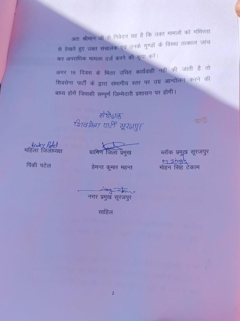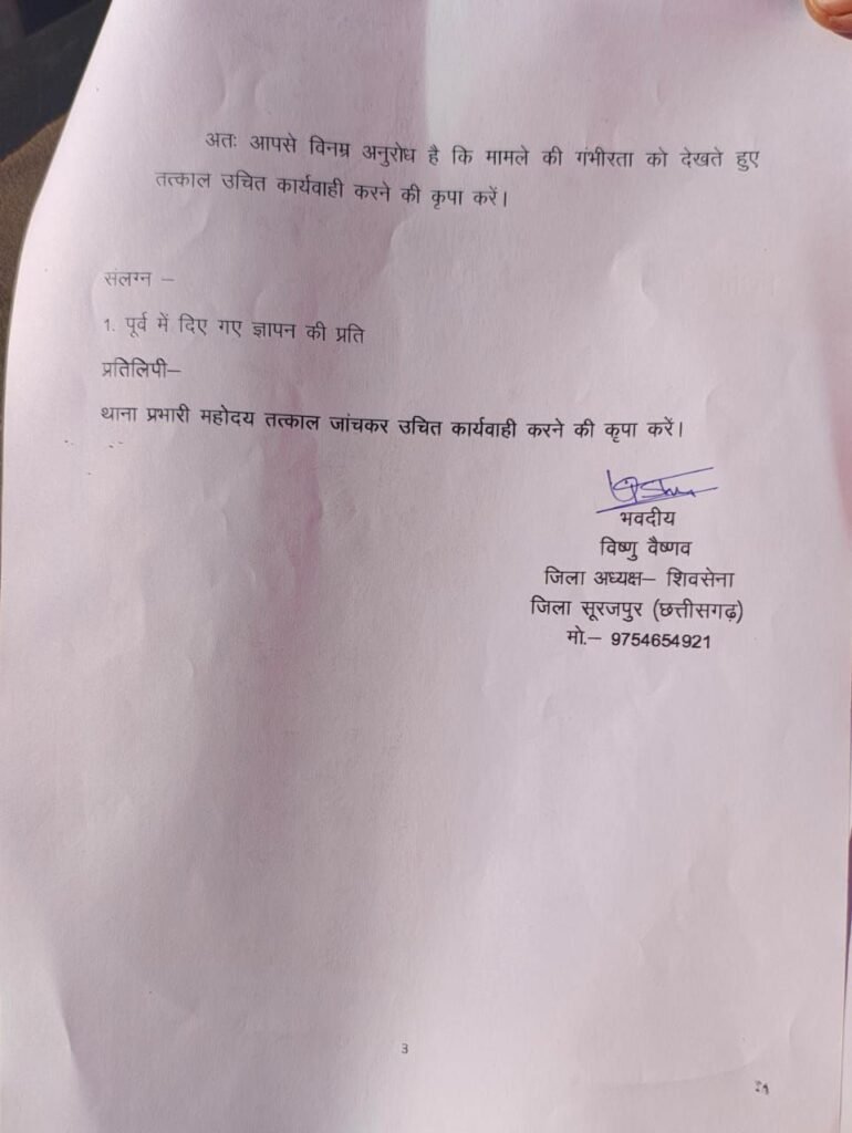 ज्ञापन सौपनें में शिवसेना जिला प्रमुख विष्णु वैष्णव,महिला जिलाध्यक्ष पिंकी पटेल,प्रेमनगर ग्रामीण जिला प्रमुख हेमंत महंत,जिला सचिव डॉ.आर एस ,नगर प्रमुख सूरजपुर साहिल,ब्लॉक प्रमुख सूरजपुर मोहन सिंह टेकाम,जिला प्रवक्ता मनेश द्विवेदी,गौतम कुमार,रजनी सिंह,कौशल्या राजवाड़े,बालकुंवर,कलावती, अनिता,अन्य शिवसैनिकगण उपस्थित रहे!