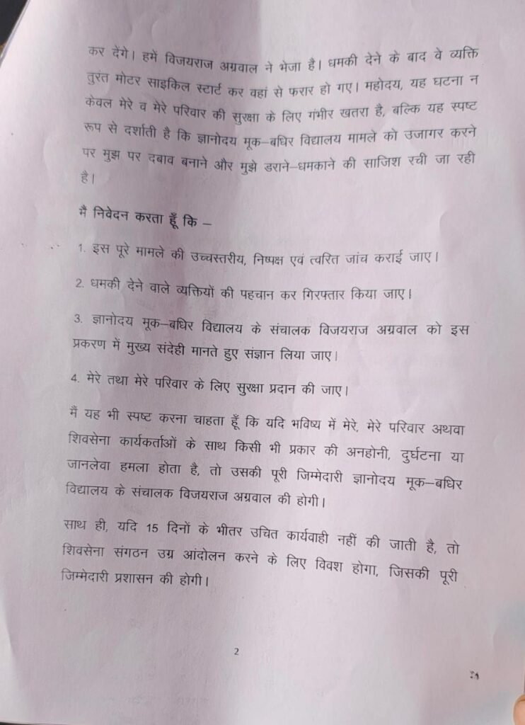 मूक बधिर विद्यालय का मामला फिर गरमाया जान से मारने की धमकी देने का आरोप लगाकर शिवसेना ने दिया ज्ञापन