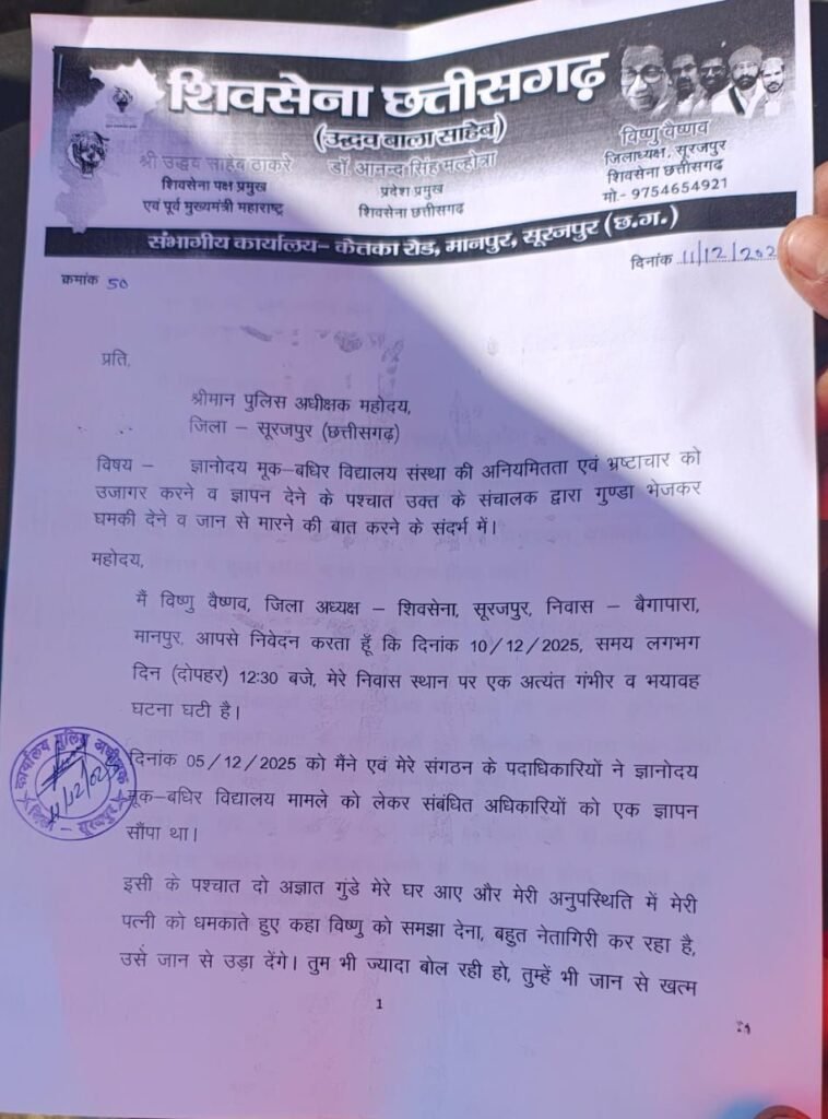 सूरजपुर/ ज्ञानोदय मुखबधिर विद्यालय विश्रामपुर का मामला थमने का नाम नही ले रहा है,,,पहले जहां इस विद्यायल के प्रबंधन पर विद्यालय परिसर में दिव्यांगों बच्चों से मजदूरी कराने के साथ कई आरोप लग चूके है और बच्चों से काम कराने का वीडियो भी वारयल हुआ था जिसपर कई विभागों की जांच जारी है,, वहीं अब विद्यायल के संचालक पर धमकी देने सहित गुंडागर्दी कराने के गम्भीर आरोप लगे है, ,,दरअसल बिते दिनों जिले के बिश्रामपुर क्षेत्र में संचालित ज्ञानोदय मुकबधिर विद्यालय में मुकबधिर बच्चों का काम करते व पेड काटने का कार्य करते हुए विडियो वायरल हुआ था,,,जिसको लेकर कलेक्टर के निर्देश पर शिक्षा,श्रम,व बाल संरक्षण विभाग के द्वारा मामले में जांच कि जा रही है,,,वही बच्चों से श्रम करायें जाने के मामले में जांच व मुकबधिर स्कूल के संचालन के संबंध में जांच हेतु शिवसेना (उद्धव बाल ठाकरे) गुट के द्वारा कलेक्टर को ज्ञापन सौंप मामले में जांच व कार्यवाही की मांग की गई थी,,,,जिसके बाद आज शिवसेना के जिला अध्यक्ष विष्णु वैष्णव अपने समर्थकों के साथ आज पुलिस अधीक्षक कार्यालय पहुँचे और उन्होंने ज्ञानोदय मुकबधिर विद्यालय के संचालक विजयराज अग्रवाल के ऊपर उनकी अनुपस्थिति में घर पर गुंडे को भेज उनकी पत्नी को धमकाने सहित मामले से दुर रहने नशीहत देने के गम्भीर आरोप लगाए है ,,,,,,जिससे नाराज सैकड़ों की संख्या में शिव सैनिक उग्र रूप दिखाते हुए आज सँयुक्त कार्यालय पहुँचे और उन्होंने कलेक्टर और एसपी को ज्ञापन सौंप मामले में कार्यवाही करने की मांग की ,,,साथ ही उन्होंने किसी शिव सैनिक के उपर कुछ भी घटना घटित होने पर ज्ञानोदय मुकबधिर विद्यालय के संचालक विजयराज अग्रवाल से जोड़ने की बात कही और यदि 15 दिवस में संबंधित पर कार्यवाही नहीं होने पर आंदोलन और धरना प्रदर्शन की चेतावनी भी दी है ,,,, वहीं पुलिस शिकायत के बाद अब मामले में जांच कर उचित कार्यवाही करने की बात कर रही है ।