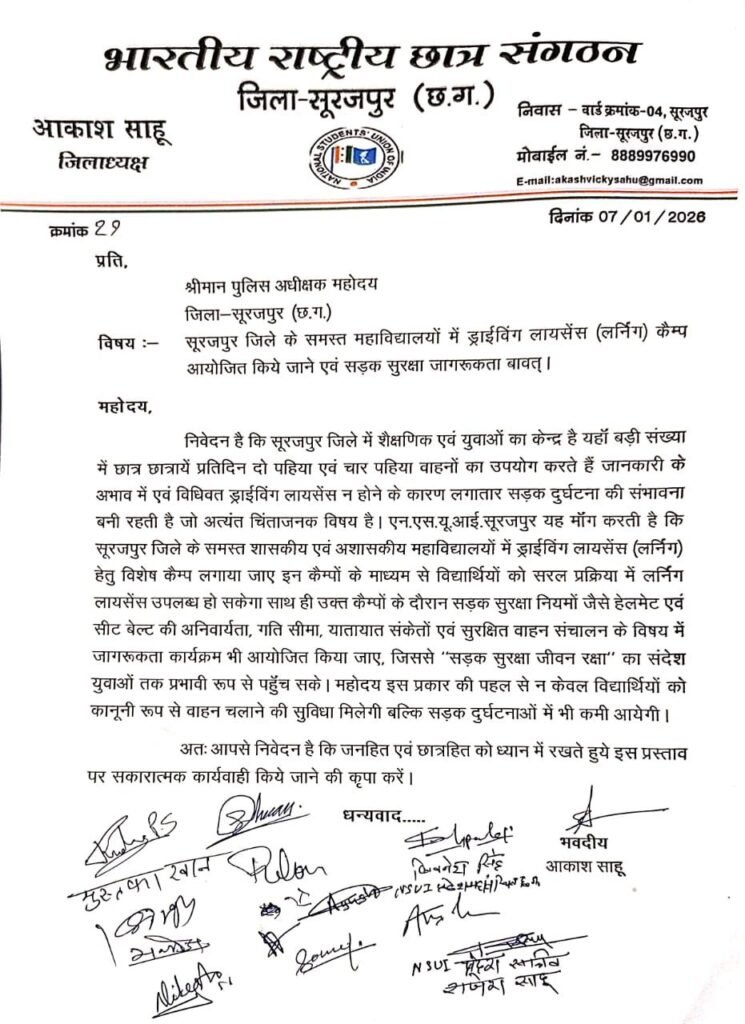 सूरजपुर जिले के समस्त महाविद्यालयों में ड्राईविंग लायसेंस (लर्निंग) कैम्प आयोजित करने एवं सड़क सुरक्षा जागरूकता अभियान चलाने हेतु एनएसयूआई जिलाध्यक्ष आकाश साहू के नेतृत्व में पुलिस अधीक्षक को ज्ञापन सौंपकर समस्त महाविद्यालयों में कैम्प लगाने की मांग की आकाश साहू ने बताया कि सूरजपुर जिला शैक्षणिक एवं युवाओं का केन्द्र है यहां बड़ी संख्या में छात्र-छात्राएं प्रतिदिन दो पहिया एवं चार पहिया वाहनों का उपयोग करते है इस बीच जानकारी के अभाव और विधिवत ड्राईविंग लायसेंस न होने के कारण लगातार सड़क दुर्घटना की संभावना बनी रहती है जो कि अत्यंत चिंताजनक विषय है इन सभी मुद्दों को लेकर एनएसयूआई ने पुलिस अधीक्षक से मिलकर सूरजपुर जिले के समस्त शासकीय एवं अशासकीय महाविद्यालयों में ड्राईविंग लायसेंस (लर्निंग) हेतु विशेष कैम्प लगाने की मांग की है जिससे विद्यार्थियों को सरल प्रक्रिया में लायसेंस उपलब्ध हो सकेगा साथ ही उक्त कैम्पो में सड़क सुरक्षा नियमों जैसे हेलमेट एवं सीट बेल्ट की अनिवार्यता,गति सीमा,यातायात संकेतों एवं सुरक्षित वाहन संचालन के विषय में जागरूकता कार्यक्रम “सड़क सुरक्षा जीवन सुरक्षा” आयोजित करने की मांग की है जिससे सड़क दुर्घटना में कमी हो सके इस दौरान एनएसयूआई प्रदेश सचिव राजेश साहू,मुस्तफा खान,सह सचिव लिवनेश सिंह,रुद्र प्रताप सिंह,रेहान,शिवम साहू,अंकुश गुप्ता,मनोज सिंह,नितेश साहू,कमलेश सिंह,सोमू खान,आयुष शांडिल्य,निलेश एवं अन्य कार्यकर्ता उपस्थित थे..