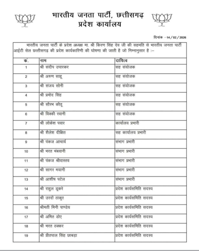 सूरजपुर – भाजपा ने अपनी कार्यकारणी का विस्तार करते हुए आई टी सेल के प्रदेश कार्यकारिणी का विस्तार किया है,,,जहां प्रदेश भाजपा अध्यक्ष श्री किरण सिंह देव की सहमति से प्रदेश भाजपा महामंत्री डॉ नवीन मार्कण्डे ने आई टी सेल के प्रदेश कार्यकारणी की सुचि जारी कि,,, जिसमें सूरजपुर जिले के एजाज अहमद उर्फ जिम्मी को प्रदेश कार्यसमिति सदस्य बनाया गया है,,, गौरतलब है कि एजाज अहमद उर्फ जिम्मी पहले भी युवा मोर्चा सहित दो बार आई टी सेल के जिला संयोजक का पद संभाल चुके हैं,,, पार्टी ने उनकी निष्ठा को देखते हुए प्रदेश में जिम्मेदारी सौंपी है,,, एजाज की नियुक्ति को लेकर कार्यकर्ताओं में काफी उत्साह नजर आ रहा है,,,तो नियुक्ति को लेकर एजाज ने कहा कि पार्टी ने जो जिम्मेदारी सौंपी है उसका निष्ठा ईमानदारी और मेहनत लगन से पालन करते हुए पार्टी को मजबूत बनाने पर काम करेंगें,, माननीय प्रधानमंत्री जी के विकसित भारत के सपने को साकार करने का कार्य करेंगे,,, वही प्रदेश कार्यसमिति सदस्य बनाए जाने पर एजाज अहमद उर्फ जिम्मी ने,, जिला अध्यक्ष मुरली मनोहर सोनी सहित मंत्री लक्ष्मी राजवाड़े, विधायक भुलन सिंह मरावी,शकुंतला पोर्ते वन विकास निगम अध्यक्ष रामसेवक पैकरा सहित वरिष्ठ भाजपा नेताओं का आभार व्यक्त किया है,,,,,