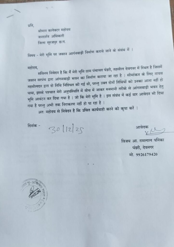आवेदन पत्र के अनुसार ग्राम पंडरी स्थित खसरा नंबर 694/1, रकबा 0.06 हेक्टेयर भूमि आवेदक के स्वामित्व एवं कब्जे में है। इसके बावजूद ग्राम पंचायत के कुछ पदाधिकारियों द्वारा उक्त भूमि पर जनरल आंगनबाड़ी भवन का निर्माण शुरू कर दिया गया है। आवेदक ने आरोप लगाया कि निर्माण कार्य से उनकी भूमि पर अधिकार प्रभावित हो रहा है और यदि समय रहते कार्रवाई नहीं की गई तो भविष्य में उनकी जमीन पर स्थायी कब्जे जैसी स्थिति बन सकती है।