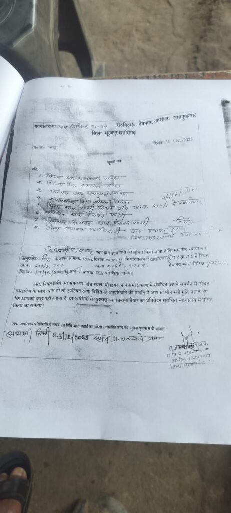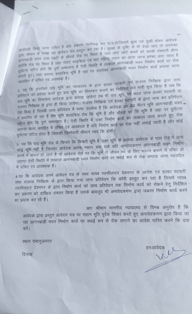रामानुजनगर/सूरजपुर। ग्राम पंडरी में आंगनबाड़ी भवन निर्माण को लेकर विवाद तूल पकड़ता जा रहा है। ग्राम पंडरी निवासी विजय कुमार (पिता रामलाल) ने नायब तहसीलदार न्यायालय देवनगर में आवेदन प्रस्तुत कर आरोप लगाया है कि उनकी निजी भूमि पर बिना सहमति आंगनबाड़ी भवन निर्माण कराया जा रहा है। आवेदक ने न्यायालय से इस निर्माण कार्य पर स्थायी रूप से रोक लगाने की मांग की है।