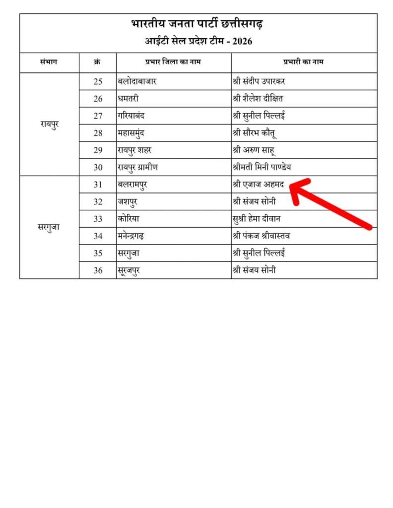 सूरजपुर -भाजपा ने अपनी आई टी सेल को मजबूती देने कार्यकारणी का विस्तार करते हुए आई टी सेल के जिला प्रभारियों की सुची जारी की है,,,जहां प्रदेश भाजपा अध्यक्ष श्री किरण सिंह देव की सहमति से प्रदेश भाजपा महामंत्री डॉ नवीन मार्कण्डे ने आई टी सेल के जिला प्रभारियों की सुचि जारी कि,,, जिसमें प्रदेश संयोजक आई टी सेल सुनील पिल्लई के नेतृत्व में सूरजपुर जिले के एजाज अहमद उर्फ जिम्मी को बलरामपुर जिले का आई टी सेल प्रभारी बनाया गया है,,, गौरतलब है कि एजाज अहमद उर्फ जिम्मी पहले भी युवा मोर्चा सहित दो बार आई टी सेल के जिला संयोजक का पद संभाल चुके हैं,,, पार्टी ने उनकी निष्ठा को देखते हुए प्रदेश में जिम्मेदारी सौंपी है,,, एजाज की नियुक्ति को लेकर कार्यकर्ताओं में काफी उत्साह नजर आ रहा है,,,तो नियुक्ति को लेकर एजाज ने कहा कि पार्टी ने जो जिम्मेदारी सौंपी है उसका निष्ठा ईमानदारी और मेहनत लगन से पालन करते हुए पार्टी को मजबूत बनाने पर काम करेंगें,, माननीय प्रधानमंत्री जी के विकसित भारत के सपने को साकार करने का कार्य करेंगे,,, वही जिला प्रभारी बनाए जाने पर एजाज अहमद उर्फ जिम्मी ने,, जिलाध्यक्ष मुरली मनोहर सोनी सहित मंत्री लक्ष्मी राजवाड़े, मंत्री रामविचार नेताम,विधायक भुलन सिंह मरावी,शकुंतला पोर्ते वन विकास निगम अध्यक्ष रामसेवक पैकरा सहित वरिष्ठ भाजपा नेताओं का आभार व्यक्त किया है,,,,,