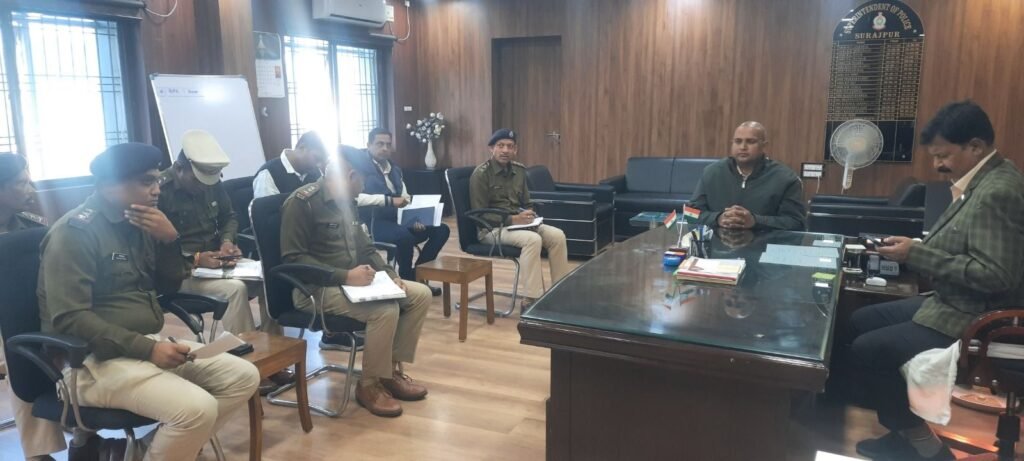 वरिष्ठ पुलिस अधीक्षक श्री प्रशांत कुमार ठाकुर ने वर्ष की विदाई व नववर्ष 2025 के आगमन पर जिले के सभी प्रमुख स्थानों, चौक-चौराहों, पर्यटन स्थलों पर सुरक्षा के पुख्ता इंतजाम किए है। एसएसपी ने पुलिस अधिकारियों की बैठक ली और पूरे जिले में सुरक्षा के कड़े इंतजाम सुनिश्चित करने के निर्देश दिए। उन्होंने जिले के सीएसपी/एसडीओपी सहित थाना-चौकी प्रभारियों को 31 दिसम्बर के रात्रि 7 बजे से रात्रि 1 बजे तक प्रभावी रूप से पैदल गश्त व पेट्रोलिंग करने, फिक्स प्वाईंट पर सजगता से चेकिंग करने, ड्रंक एंड ड्राईव और यातायात नियमों के उल्लघंन पर कार्यवाही तथा नए वर्ष में जिले के सभी पिकनिक स्थलों पर कड़ी सुरक्षा व्यवस्था हेतु पर्याप्त संख्या में पुलिस के अधिकारी व जवानों की ड्यूटी लगाई है। असामाजिक तत्वों की प्रत्येक गतिविधियों पर सूरजपुर पुलिस की विशेष पैनी नजर रहेगी। बैठक में एएसपी संतोष महतो व थाना प्रभारीगण सहित अन्य पुलिस अधिकारी मौजूद रहे।